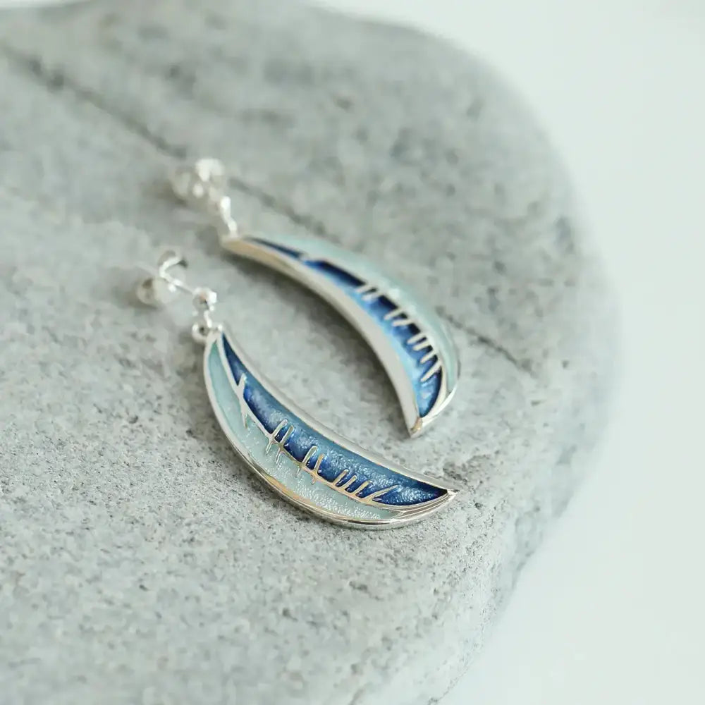 These Skyran moon drop earrings in sterling silver feature a curved design with ancient Ogham script that says ‘Moon’. The earrings are hand-enameled in our Orkney workshop.